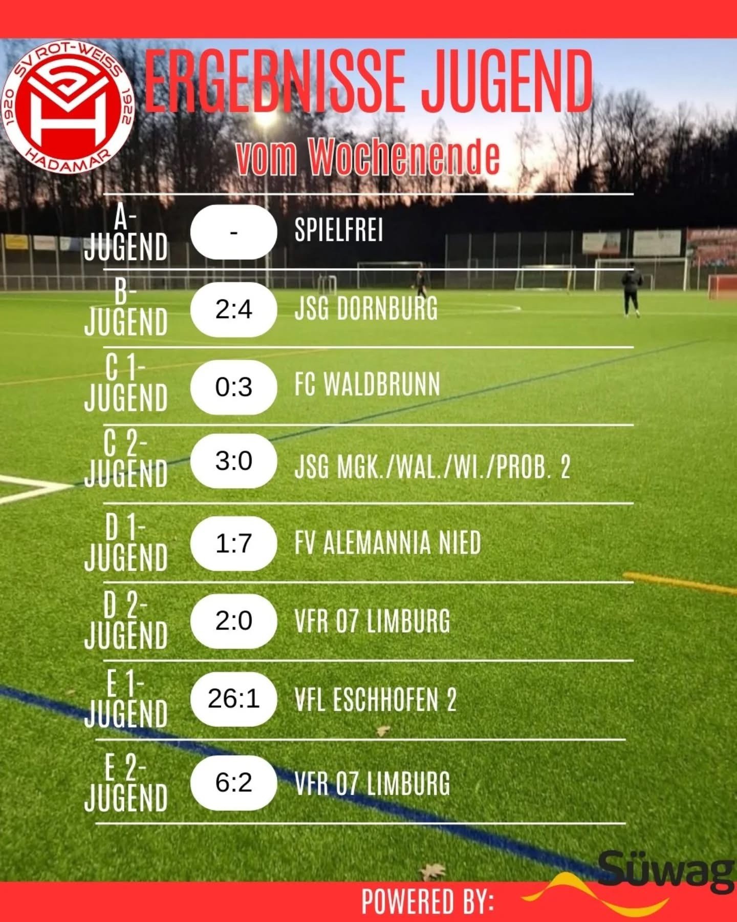 Für einen famosen Start in das Wochenende sorgte am Donnerstag bereits unsere E1. Gegen den VfL Eschhofen hieß es am Ende 26:1.Auch unsere C2 konnte einen Erfolg verbuchen. Gegen die JSG Dornburg gewann man mit 3:0. Auch unsere D2 und unsere E2 konnten Ihre Spiele am Wochenende für sich entscheiden. Gegner bei beiden, der VFR 07 Limburg. Bei der D2 endete das "Derby" 2:0 für Rot-Weiß, die E2 gewann sogar mit 6:2.